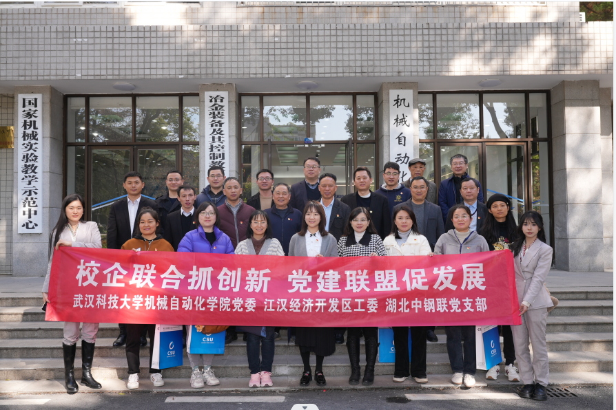 湖北中鋼聯(lián)冶金工程有限公司是江漢創(chuàng)谷文化與科技融合示范集聚區(qū)優(yōu)秀民營(yíng)企業(yè),也是黨建聯(lián)盟輪值主席單位。為加強(qiáng)基層黨建工作的交流與探索,提升黨建引領(lǐng),促進(jìn)企業(yè)高質(zhì)量發(fā)展。12 月 7 日,中鋼聯(lián)黨支部組織在寶武鋼鐵有限公司和武漢 科技大學(xué)機(jī)械學(xué)院開(kāi)展“校企聯(lián)合抓創(chuàng)新,黨建聯(lián)盟促發(fā)展”黨建聯(lián)盟活動(dòng),江漢經(jīng)濟(jì)開(kāi)發(fā)區(qū)工委副書(shū)記戴瑩、江漢經(jīng)濟(jì)開(kāi)發(fā)區(qū)管委會(huì)副主任艾亮、江漢經(jīng)濟(jì)開(kāi)發(fā)區(qū)“兩新”黨建指導(dǎo)員洪修平、趙挺松、潘曉光、武漢科技大學(xué)機(jī)械自動(dòng)化學(xué)院黨委副書(shū)記瞿孝平、機(jī)械自動(dòng)化學(xué)院副院長(zhǎng)王蕾、中鋼聯(lián)總經(jīng)理何雙林、中鋼聯(lián)黨支部副書(shū)記朱聰、江漢創(chuàng)谷文化與科技融合示范集聚區(qū)黨建聯(lián)盟單位代表等共 30 余人參加了此次活動(dòng),并圓滿舉行。